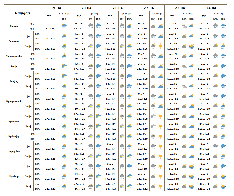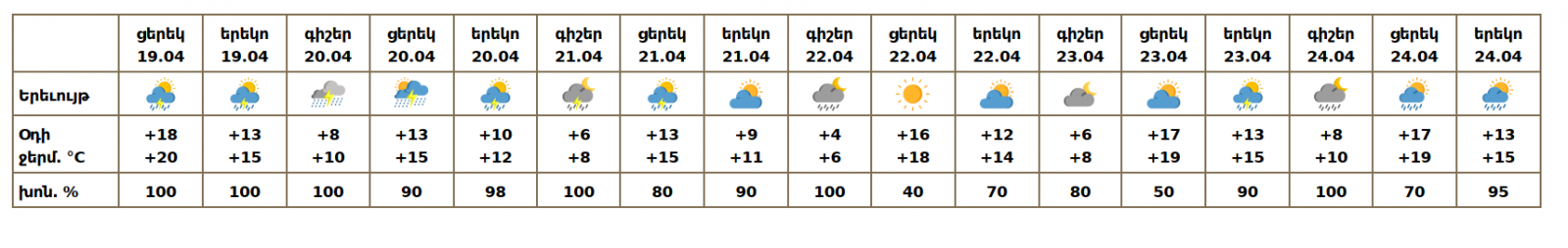 Հանրապետության տարածքում ապրիլի 20-21-ին ժամանակ առ ժամանակ շրջանների զգալի մասում, 22-ի գիշերը, 23-ի ցերեկը, 24-ին առանձին շրջաններում սպասվում է անձրև, հնարավոր է ամպրոպ։ Ապրիլի 19-ի երեկոյան ժամերին, 20-21-ին, 22-ի գիշերն առանձին շրջաններում տեղումները կլինեն ինտենսիվ։ Ապրիլի 20-22-ին, 24-ին տեղումները լեռնային շրջաններում գիշերը և առավոտյան ժամերին կլինեն թաց ձյան տեսքով։ Ապրիլի 22-ի ցերեկը, 23-ի գիշերը սպասվում է առանց տեղումների եղանակ։