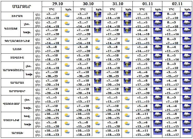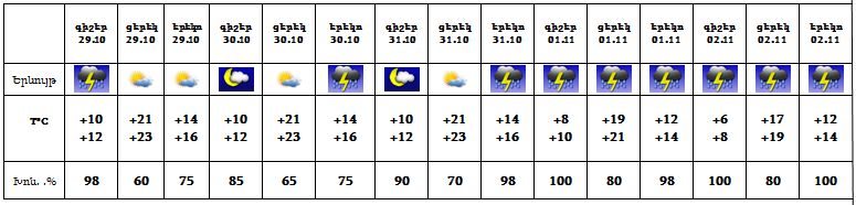 Հոկտեմբերի 29-ի գիշերը, նոյեմբերի 1-2-ը շրջանների զգալի մասում, հոկտեմբերի 30-31-ը արևմտյան շրջաններում սպասվում է անձրև և ամպրոպ, առանձին շրջաններում՝ քամու ուժգնացում՝ 15-20 մ/վ արագությամբ: 29-ի ցերեկը սպասվում է առանց տեղումների եղանակ: