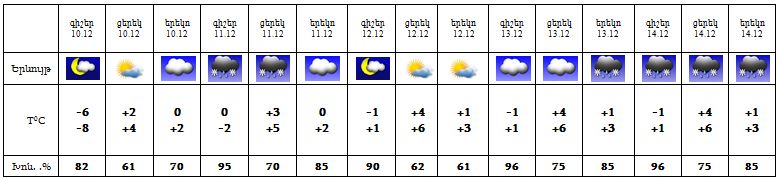 Հանրապետության տարածքում` Դեկտեմբերի 10-ի երեկոյան ժամերին, 11-ին, 13-ին Շիրակում, Կոտայքում, Արագածոտնում, Արարատում, Արմավիրում և Վայոց ձորում սպասվում են թույլ տեղումներ: 14-ին շրջանների զգալի մասում ժամանակ առ ժամանակ սպասվում են տեղումներ: 12-ին սպասվում է առանց տեղումների եղանակ: Քամին՝ հյուսիս-արևմտյան՝ 3-8 մ/վ արագությամբ: Օդի ջերմաստիճանը 10-11-ը՝ հատկապես գիշերը, աստիճանաբար կբարձրանա 8-10 աստիճանով: