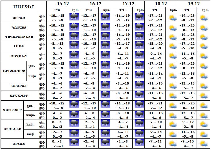 Հանրապետության տարածքում` Դեկտեմբերի 15-ին շրջանների զգալի մասում սպասվում է ձյուն, 16-17-ը սպասվում է թույլ ձյուն: 18-19-ը սպասվում է առավելապես առանց տեղուների եղանակ: Քամին՝ հյուսիս-արևմտյան՝ 3-8 մ/վ արագությամբ, 15-ին առանձին հատվածներում սպասվում է քամու ուժգնացում‵ 15-20 մ/վ, բուք և ցածր հորիզոնական տեսանելիություն: Օդի ջերմաստիճանն աստիճանաբար կնվազի 10-12 աստիճանով: