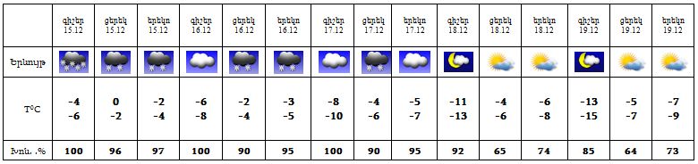 Երևանում՝ Դեկտեմբերի 15-ին ժամանակ առ ժամանակ կտեղա ձյուն: 16-17-ը սպասվում է թույլ ձյուն, 18-19-ը՝ առանց տեղումների եղանակ: