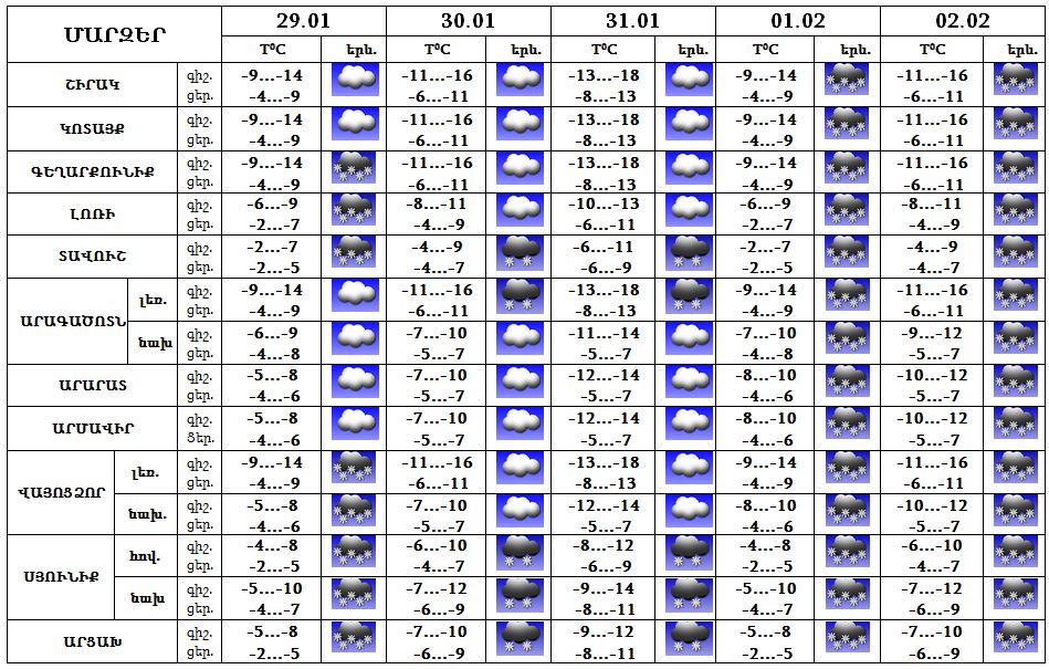 Հանրապետության տարածքում` Հունվարի 29-ի գիշերը, փետրվարի 1-2-ը շրջանների զգալի մասում, հունվարի 29-ի ցերեկը, 30-31-ը Լոռիում, Տավուշում, Սյունիքում և Արցախում սպասվում է ձյուն, լեռնային շրջաններում և լեռնանցքներում‵ բուք, ցածր հորիզոնական տեսանելիություն: Քամին՝ հարավ-արևմտյան՝ 3-8 մ/վ արագությամբ: Հունվարի 29-ին առանձին հատվածներում սպասվում է քամու ուժգնացում‵ 16-18 մ/վ: Օդի ջերմաստիճանը 29-31-ը աստիճանաբար կնվազի 4-6 աստիճանով:
