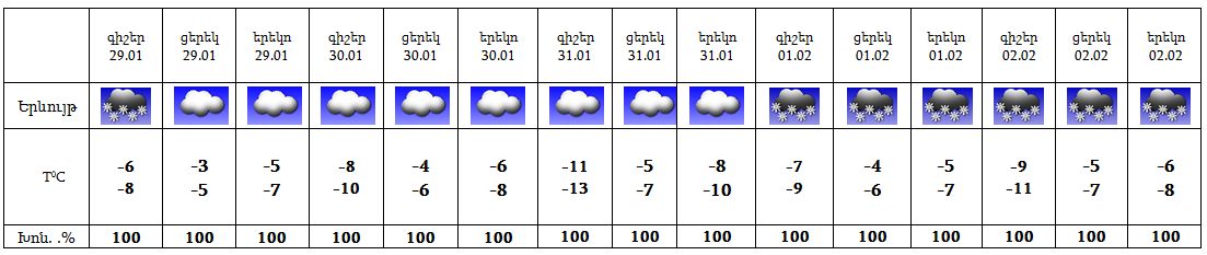 Երևան քաղաքում՝ Հունվարի 29-ի գիշերը, փետրվարի 1-2-ը սպասվում է ձյուն: Հունվարի 29-ի ցերեկը, 30-31-ը սպասվում է ամպամածություն, տեղումների հավանականությունը փոքր է: