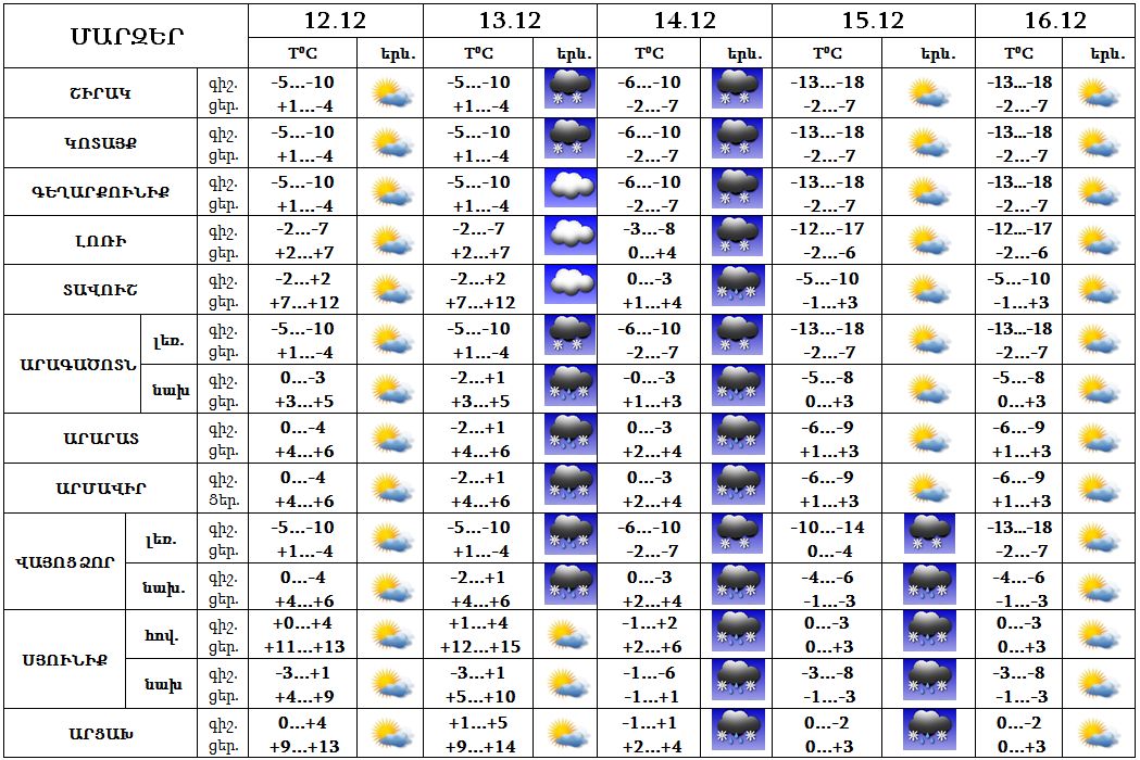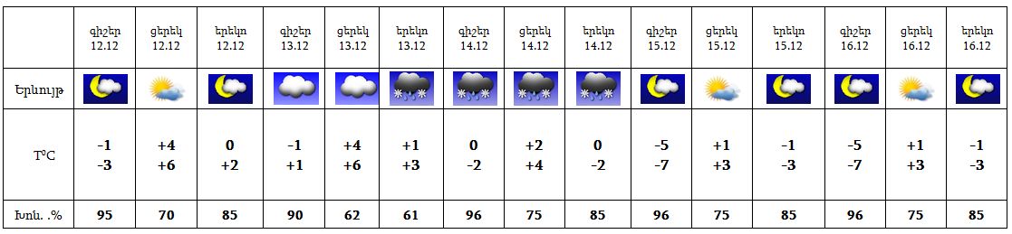 Երևանում` Դեկտեմբերի 12-ին, 15-16-ը սպասվում է առանց տեղումների եղանակ: 13-ին հնարավոր են թույլ տեղումներ: 14-ին ժամանակ առ ժամանակ սպասվում են տեղումներ: