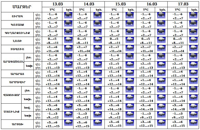 Հանրապետության տարածքում` Մարտի 13-ի գիշերը սպասվում է առանց տեղումների եղանակ, 13-ի ցերեկը, 14-17-ը շրջանների զգալի մասում ժամանակ առ ժամանակ սպասվում են կարճատև տեղումներ, լեռնային գոտիներում թաց ձյան և ձնախառն անձրևի, նախալեռնային և հովտային գոտիներում՝ անձրևի տեսքով: Քամին՝ հարավ-արևմտյան՝ 3-8 մ/վ արագությամբ: Օդի ջերմաստիճանն էապես չի փոխվի: