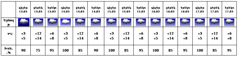 Երևան քաղաքում՝ Մարտի 13-ի գիշերը սպասվում է առանց տեղումների եղանակ, 13-ի ցերեկը, 14-17-ը ժամանակ առ ժամանակ սպասվում է կարճատև անձրև: