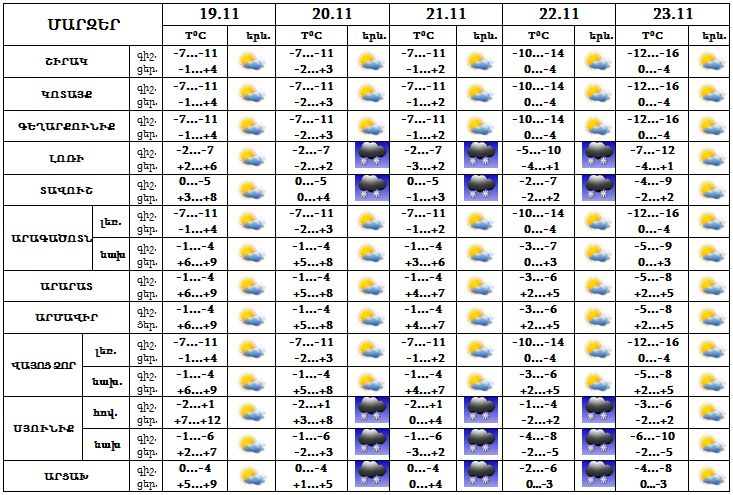 Հանրապետության տարածքում նոյեմբերի 19-ին և 23-ին սպասվում է առանց տեղումների եղանակ: 20-22-ը Լոռիում, Տավուշում, Սյունիքում և Արցախում սպասվում է թույլ ձյուն: Քամին՝ հյուսիս-արևելյան՝ 3-8 մ/վ արագությամբ: Օդի ջերմաստիճանն աստիճանաբար կնվազի 4-5, Լոռիում, Տավուշում, Սյունիքում և Արցախում` 6-8 աստիճանով:
