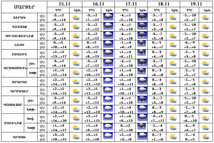 Հանրապետության տարածքում նոյեմբերի 15-ին, 18-19-ը սպասվում է առանց տեղումների եղանակ, 16-ի երեկոյան ժամերին, 17-ին շրջանների զգալի մասում սպասվում են տեղումներ: Քամին՝ հարավ-արևմտյան՝ 3-8 մ/վ արագությամբ: Օդի ջերմաստիճանն աստիճանաբար կնվազի 6-8 աստիճանով: