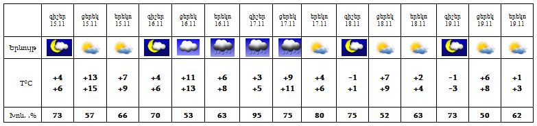Երևանում նոյեմբերի 15-ին, 18-19-ը սպասվում է առանց տեղումների եղանակ, 16-ի երեկոյան ժամերին, 17-ին‵ մինչև կեսօր, սպասվում են տեղումներ: