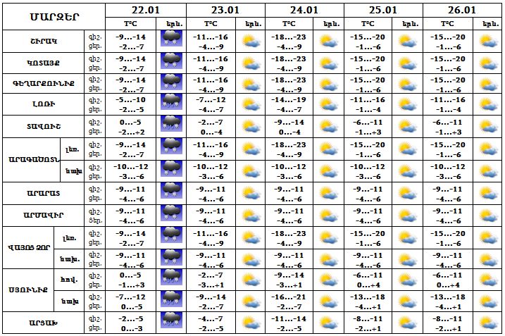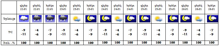Երևան քաղաքում` Հունվարի 22-ի օրվա երկրորդ կեսին, 23-ի գիշերը սպասվում է թույլ ձյուն: 23-ի ցերեկը, 24-26-ը սպասվում է առանց տեղումների եղանակ: