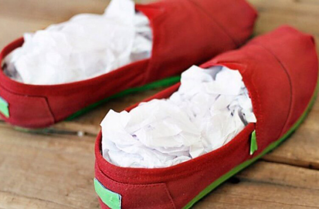 Հին թերթեր։ Թրջված կոշիկների մեջ հին խոնավ թերթեր դրեք։ Կոշիկը փաթաթեք թղթով, իսկ խոնավ թերթերը հարկավոր է հաճախակի փոխել։ Եթե կոշիկը բաց գույնի է, զուգարանի թուղթ օգտագործեք։