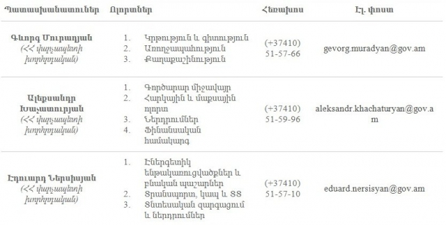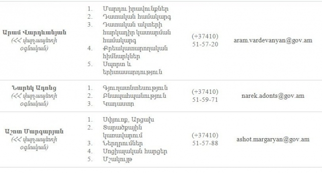 Վարչապետ Կարեն Կարապետյանի հանձնարարականի համաձայն ներկայացնում ենք կառավարության աշխատակազմի պատասխանատուներին՝ ըստ ոլորտների, ինչպես նաև նրանց կոնտակտային տվյալները, որոնց միջոցով հանրությունը և գործարար համայնքը կարող են կապ հաստատել, ներկայացնել վարչապետին ուղղված իրենց հարցերն ու առաջարկությունները: