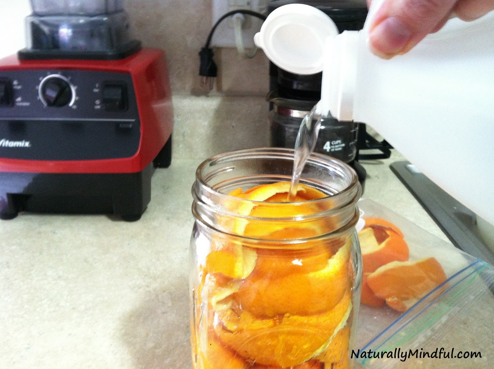 Նարնջի կեղևը (կարող եք այլ ցիտրուսային մրգերի կեղև էլ ընտրել) լցրեք ապակե տարայի մեջ, վրան քացախ ավելացրեք և թողեք խառնուրդը 2 շաբաթ մնա մութ սենյակում: