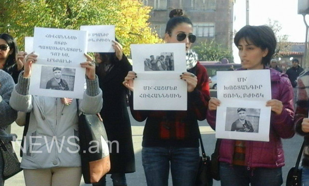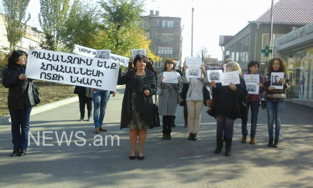 Երեւանի «Էրեբունի» բժշկական կենտրոնում այսօր` նոյեմբերի 6-ին, «Հայ կանանց ճակատն», ի պաշտպանություն «Սասնա ծռեր» խմբի անդամ Հովհաննես Հարությունյանի, ակցիա իրականացրեց: NEWS.am-ի թղթակիցն հաղորդում է, որ ակցիայի մասնակիցները «Պահանջում են Հովհաննեսի ոտքի նկարը», «Մի՛ խոշտանգեք ծռին, բժիշկ», «Քո պարտքը կատարի՛ր բժի՛շկ, ոչ թե հրահանգ» գրությամբ պաստառներով մի քանի րոպե կանգնեցին հիվանդանոցի դիմաց: