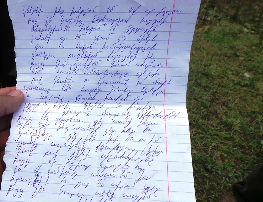 Քիչ առաջ ֆոտոլրագրողը հայտնեց՝ ոստիկաններն ու գյուղապետարանի աշխատակիցները Հ. Եղիազարյանի տանը հայտնաբերել են նամակ և այն ընթերակաների ներկայությամբ առգրավել են։ Նամակի իսկությունը պարզելու համար նշանակվելու է ձեռագրաբանական փորձաքննություն։ Ներկայացնում ենք նամակը.